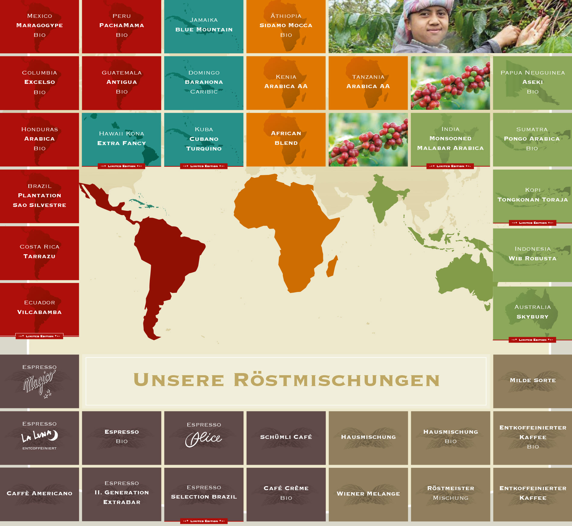 Von den besten Kaffee-Anbauregionen in rund 30 Nationen, verteilt auf vier Kontinente, stammen unsere Rohkaffees: aus Afrika, der Heimat der Kaffeepflanze, Südamerika und Karibik, Asien und Ozeanien.